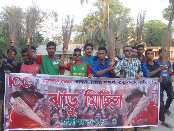 বিশ্বকাপ ক্রিকেটে ২০১৫ এর দ্বিতীয় কোয়ার্টার ফাইনালে ভারতের বিরুদ্ধে বাংলাদেশের ম্যাচের সময় আম্পায়ার আলিমদার ও ইয়ান স্মীথের ভুল সিদ্ধান্তের কারনে এবং আইসিসি’র পক্ষপাত দুষ্ট আচরণে সংক্ষুব্ধ হয়ে শরীয়তপুরে ক্রিকেটপ্রেমী কিছু প্রতিবাদী যুবক আইসিসি’র বিরুদ্ধে ঝাড়ু মিছিল করেছে।